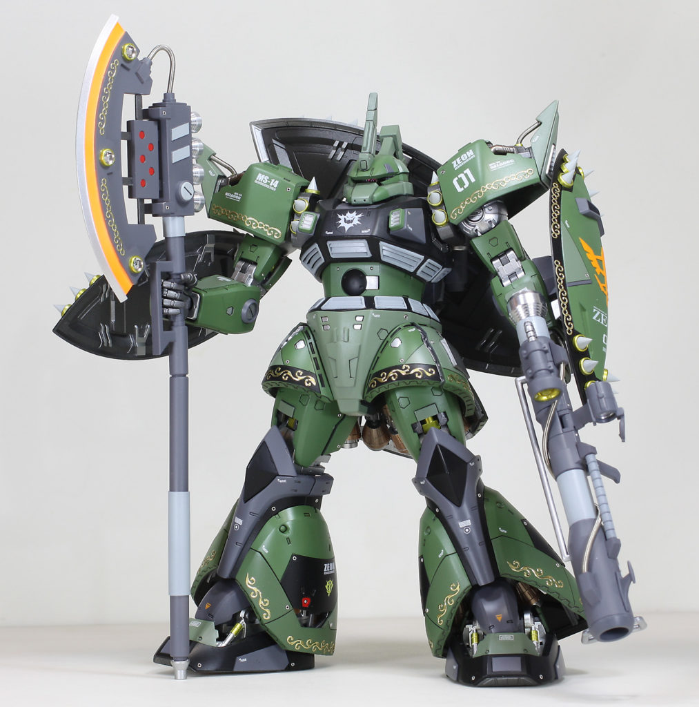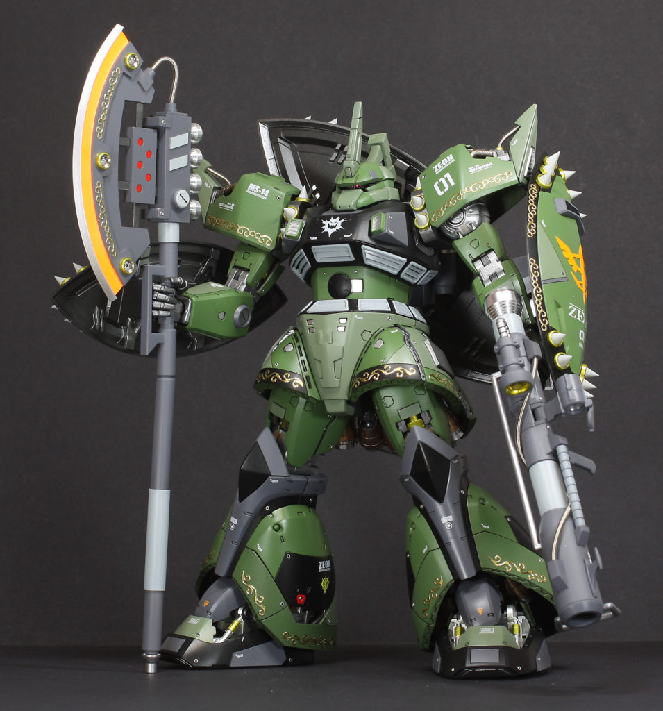 ドズルっぽくワイルドに、なおかつ高貴に仕上げました。装甲などの縁にあるエングレービング模様はエレガントカットシールを使っています。経年劣化で剥がれないか心配です。